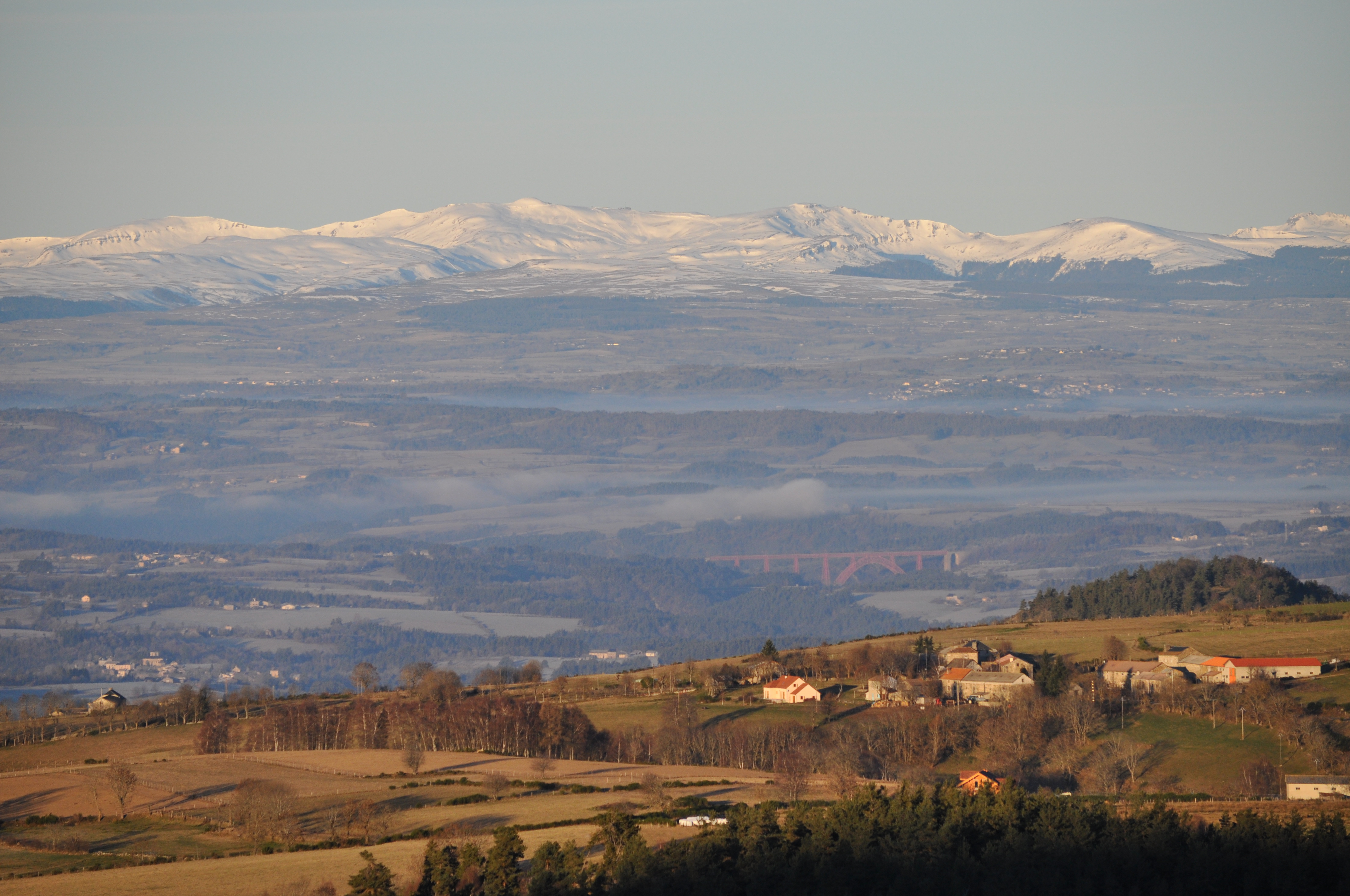 Depuis les contreforts de la Margeride, superbe panorama d’automne sur le viaduc de Garabit, la vallée de la Truyère (dans la brume) et le massif du Cantal.