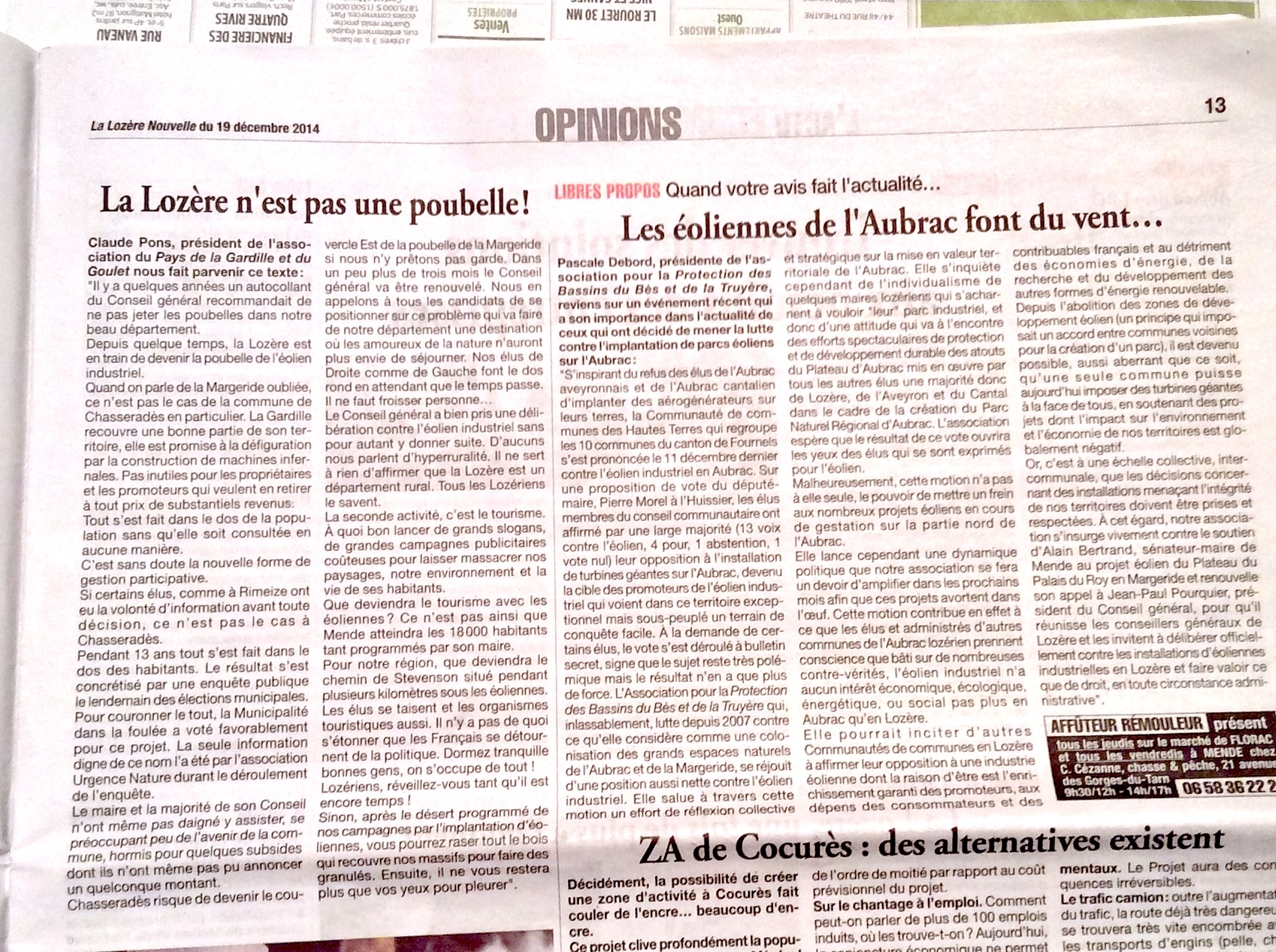 Il faut donc souhaiter que cette puce parvienne aussi jusqu’aux oreilles d’Alain Bertrand. Celui-ci ferait bien de s’interroger sur les raisons qu’à son collègue de redouter que la Margeride ne soit défigurée. Il n’est pas non plus interdit d’espérer, voir de suggérer, que ces messieurs réfléchissent ensemble à une politique commune de valorisation économique et sociale de la Margeride, qui soit respectueuse d’un Patrimoine d’une rare authenticité: écosystèmes, paysages, architecture, etc… Certes la réforme territoriale ne fera qu’éloigner les uns des autres les centres de gravité des institutions gouvernant cette belle région, mais MM. Jarlier et Bertrand étant tous deux sénateurs, on peut penser qu’il existe et continuera d’exister entre eux une certaine proximité géographique de temps à autre… Quant à une éventuelle distance politique entre les deux, la Margeride s’en contrefiche. Bref, à la veille d’une nouvelle année, on souhaite ardemment que la fée du bon sens touche Alain Bertrand de sa baguette magique et lui rappelle au passage une autre initiative récente (11/12/2014) de la communauté de communes des Hautes Terres (canton de Fournels) qui a voté à une très large majorité contre l’éolien industriel en Aubrac (voir la Lozère Nouvelle du 19/12/ 2014, qui reprend intégralement notre communiqué à ce sujet).