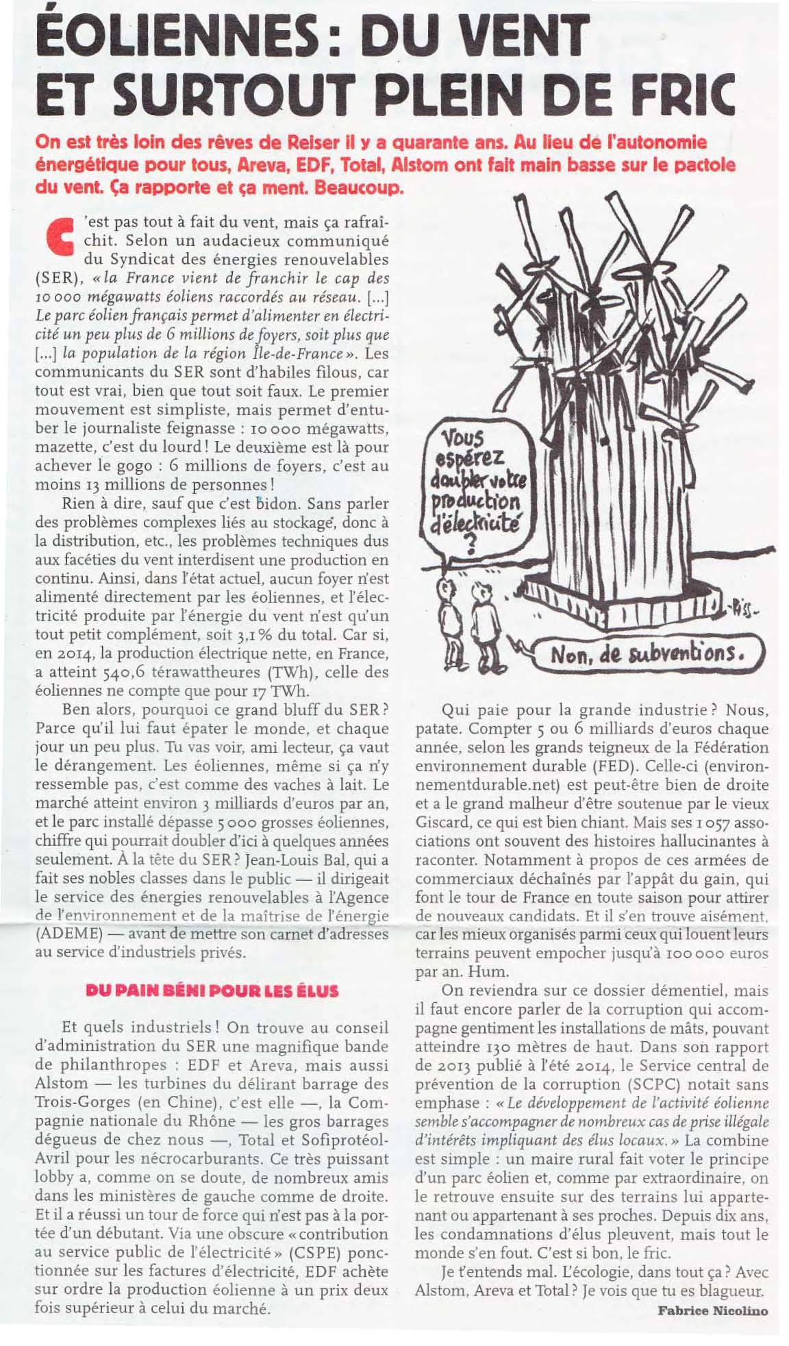 2/ La multiplication ces dernières années de cas de corruption et/ou de prises illégales d’intérêt touchant des élus locaux met également en lumière le cynisme des entreprises de ce secteur industriel. Alors qu’elles connaissent parfaitement la loi (leur action est encadrée par une armée d’avocats), elles n’hésitent pas à laisser, voire à pousser les élus de petites communes rurales -souvent perdus dans les méandres du droit administratif et pénal- à commettre des erreurs qui passent souvent inaperçues ou ne sont pas identifiées dans le délai administratif légal, ce qui permet de valider une implantation industrielle dont le seul objectif est de récupérer des subventions d’Etat. Illustration: les cas en France sont tellement nombreux que le préfet de Lozère a rédigé en août 2014 une circulaire sur la transparence de la vie publique pour rappeler aux élus les risques de prise illégale d’intérêts et de conflits d’intérêt. C’est bien l’activité éolienne, spécifiquement mentionnée dans l’avant-dernier paragraphe de ce texte, qui a motivé la circulaire. L’Etat est là dans son rôle, mais ce rôle trouve rapidement ses limites car 1/ la préfecture n’a pas les moyens de vérifier la légalité de toutes les délibérations prises dans le cadre du développement éolien en Lozère; 2/ elle n’a aucune prise sur les promoteurs d’éolien qui continuent d’avancer leurs chars d’assauts sans se soucier des dégâts collatéraux sur la vie publique des petites communes rurales. Seule la vigilance du citoyen -à travers les associations de la vie civile- fait la différence, en permettant de débusquer les supercheries et en informant la population. Pour autant, certains n’hésitent pas à nous reprocher ce rôle publiquement!