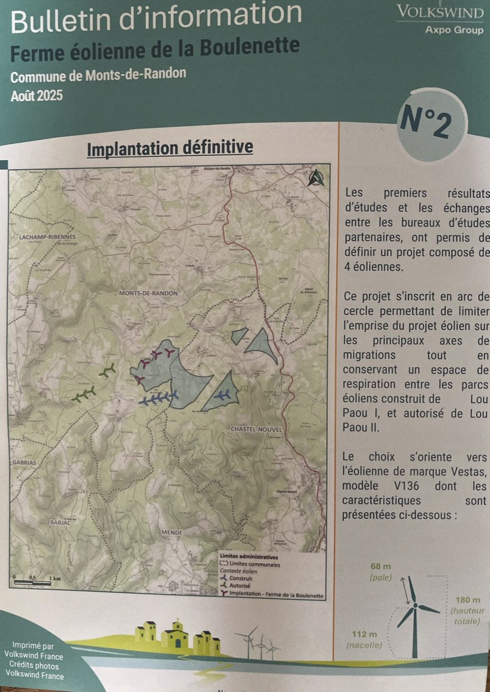 La société, Volkswind, pionnière dans le secteur de l’éolien en Allemagne (laquelle est saturée d’éoliennes), organise une réunion d’information le 27 août 2025 entre 10h et 14h à la salle Jean-Jaurès à Mende. Le sujet de la réunion? Un projet de 4 éoliennes de 180m de haut sur Monts de Randon, près des parcs actuels de Lou Paou.