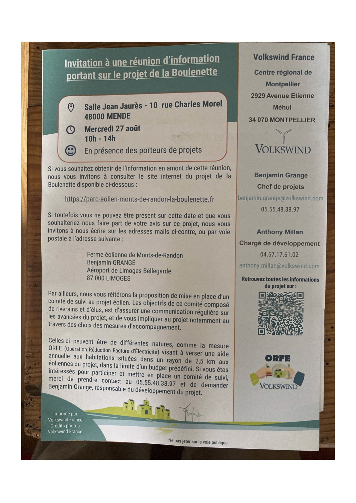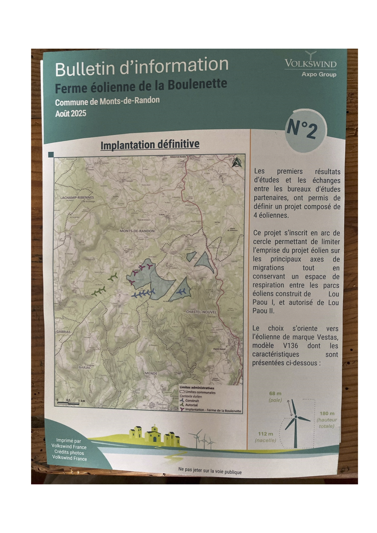 La société, Volkswind, pionnière dans le secteur de l’éolien en Allemagne (laquelle est saturée d’éoliennes), organise une réunion d’information le 27 août 2025 entre 10h et 14h à la salle Jean-Jaurès à Mende. Le sujet de la réunion? Un projet de 4 éoliennes de 180m de haut sur Monts de Randon, près des parcs actuels de Lou Paou.
